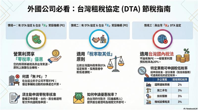 在適用 DTA 時,如果外國公司被定義為在台灣沒有 PE(常設機構),則將被視為非台灣國內來源的收入,